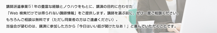 講師派遣業51年の豊富な経験とノウハウをもとに、講演の目的に合わせた「Web検索だけでは得られない講師情報」をご提供します。